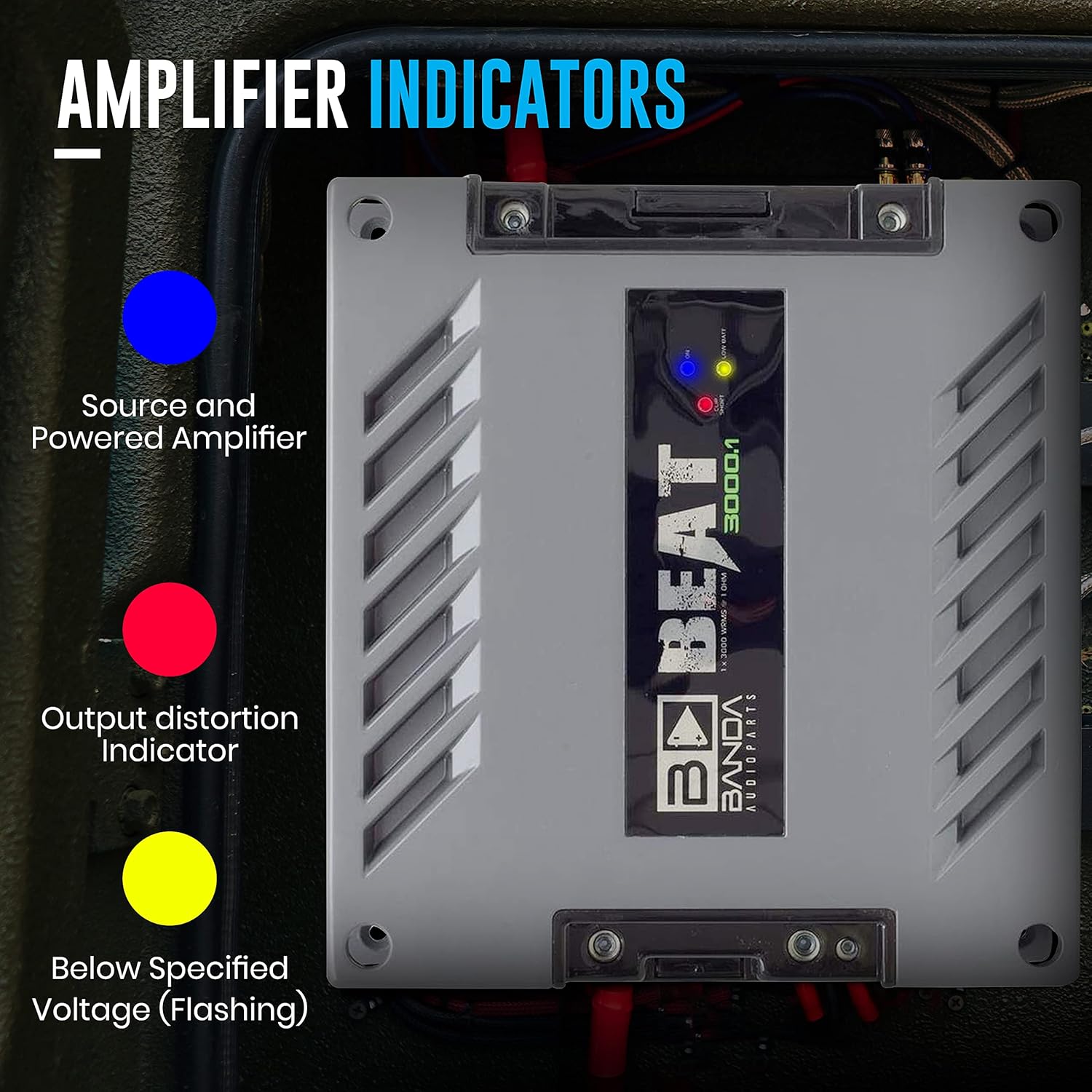 CAR AUDIO AMPLIFIER INDICATORS: Blue LED: source and powered amplifier indicator, Red LED: output distortion (clipping), shorting and thermal protection indicator, Yellow LED: below specified voltage indicator (flashing)