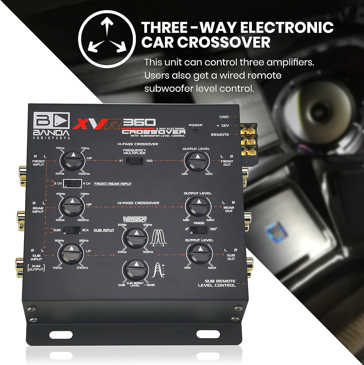 REMOTE SUBWOOFER LEVEL CONTROL: The 3-Way Electronic Car Crossover has remote Subwoofer Level Control, Ground Loop Isolation Circuit Gold Plated RCA & Power Connections with Phase reversal switch