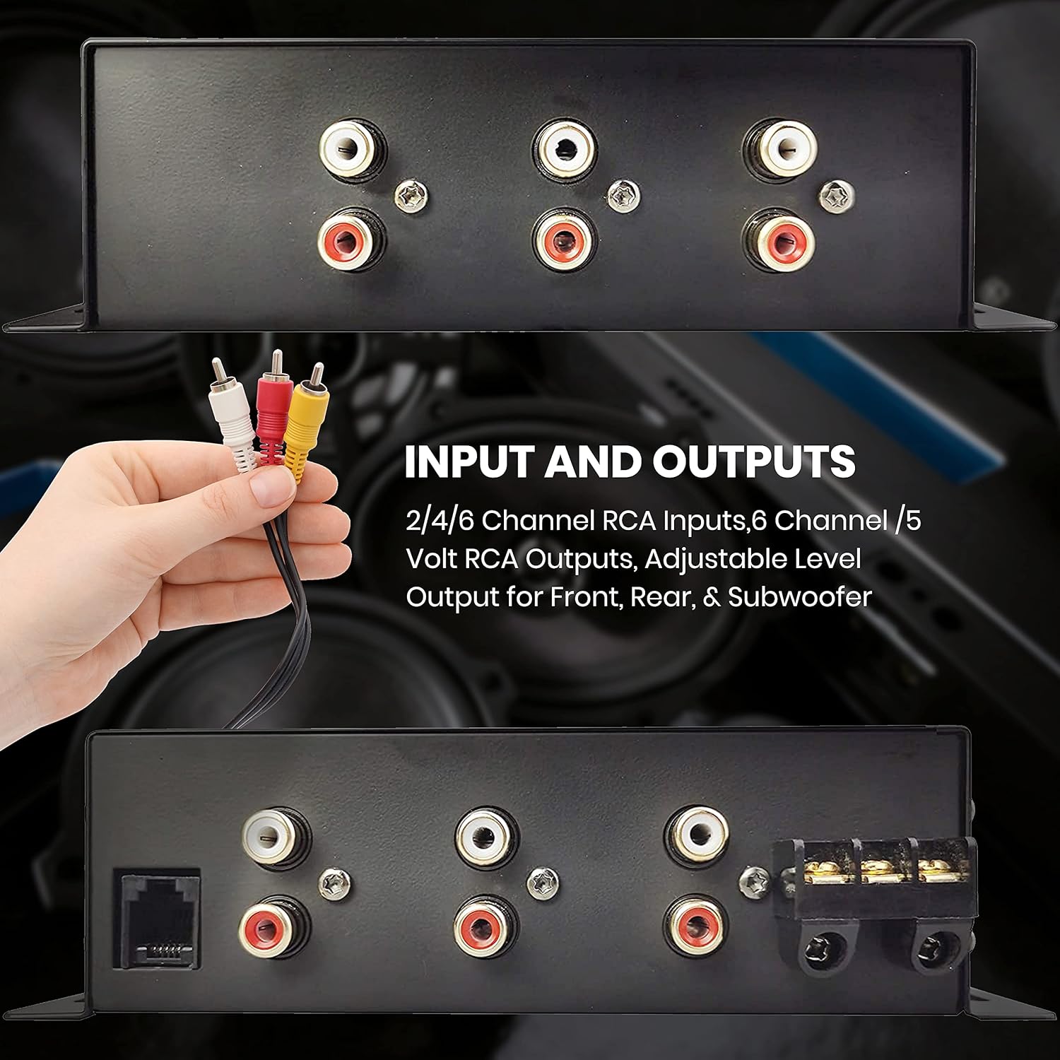INPUTS AND OUTPUTS : 2/4/6 Channel RCA Inputs,6 Channel /5 Volt RCA Outputs, Adjustable Level Output for Front, Rear, & Subwoofer, Adjustable High & Low Pass Crossover w/ Frequency Multiplier Non Fade Low Pass Output Subwoofer Bass Boost Control