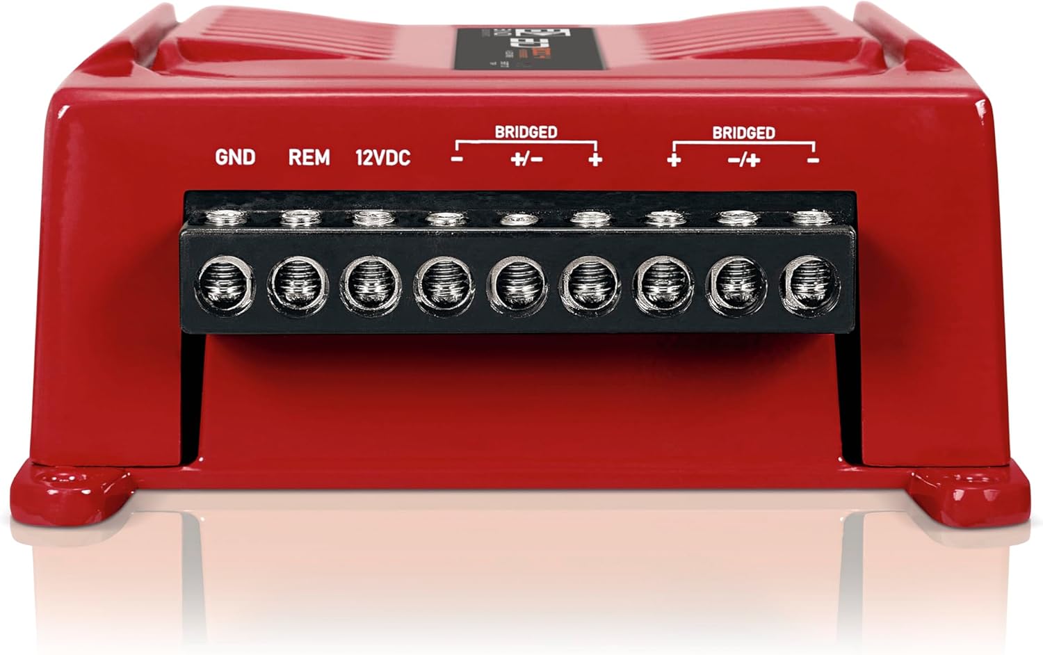 “SPECIFICATIONS Model # BD800.42OHMRED Color : Red 800.4 : 4 x 100 WRMS | Total Power 14,4 @ 2 Ohms : 4 x 260 WRMS | Total Power 14,4 @ 4 Ohms : 2 x 520 WRMS | Total Power 12,6 @ 2 Ohms : 4 x 200 WRMS | Total Power 12,6 @ 4 Ohms : 2 x 400 WRMS | Efficiency @ 4 Ohms : 0.84 | Efficiency @ 2 Ohms : 0.78 | “