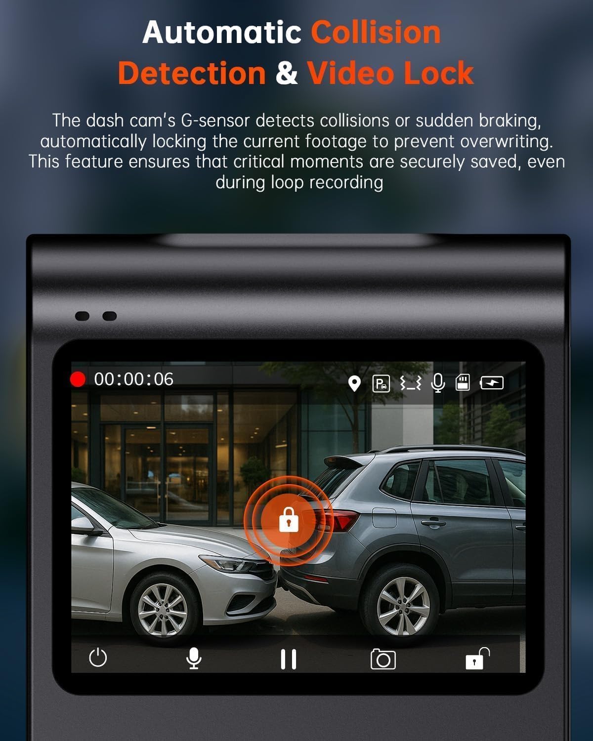 The dash cam uses loop recording, which automatically overwrites old footage. Collision-triggered videos are auto-locked and won’t be deleted.