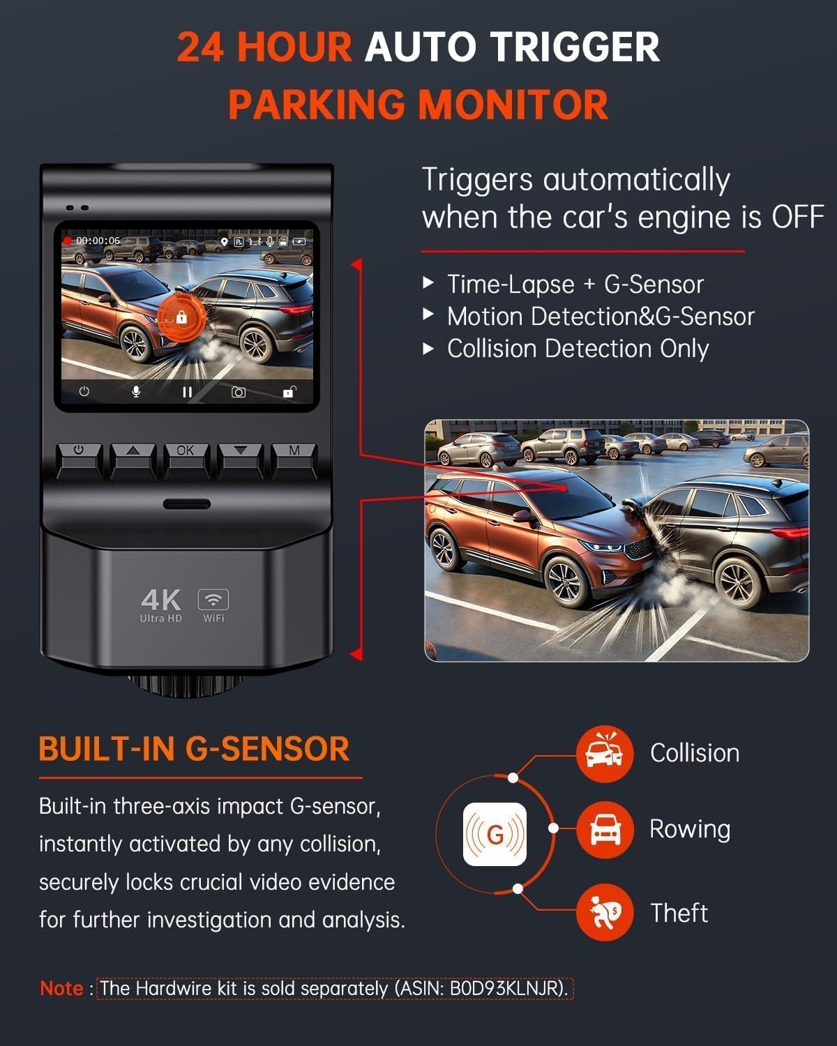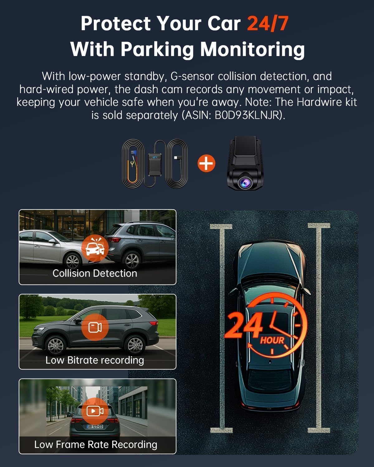 Enhanced Safety and Reliability:Even when the memory card is full, the Ecomoment dash cam will continue recording with its Loop Recording feature. As soon as the G sensor detects a sudden collision, it locks and saves the collision video. The dash cam also has a 24-hour parking monitor available to record continuously for 24 hours with a time-lapse function in parking mode. Please note that a hardwire kit is needed.