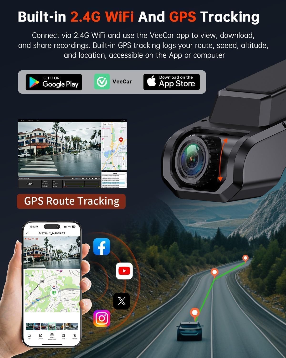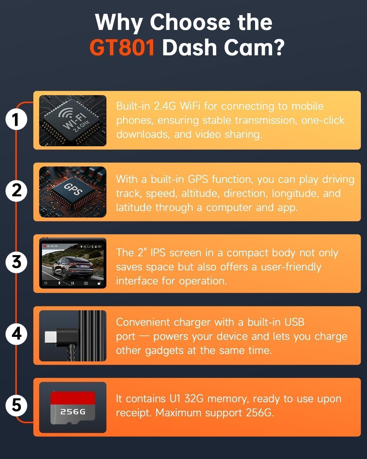 WiFi & Smart Control:The GT801 dash cam features built-in WiFi connectivity, allowing you to wirelessly access and manage recordings through your smartphone. Simply connect to the dash cam’s WiFi network and use the companion app to view, download, and share your driving footage. All device settings can be conveniently adjusted via your mobile device.
