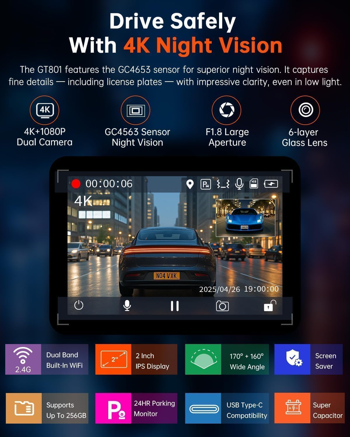 Superior Night Vision:Equipped with a starlight night vision sensor and a 170° ultra-wide 6-layer glass lens, the GT801 dashcam front and rear camera easily adapts to low-light conditions, delivering clear and detailed footage even in the most challenging lighting situations.