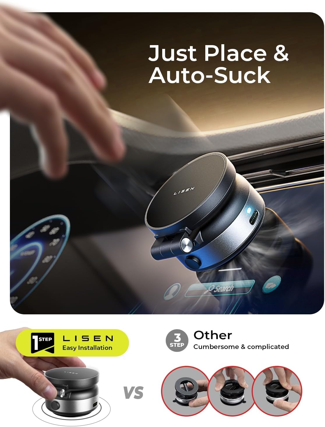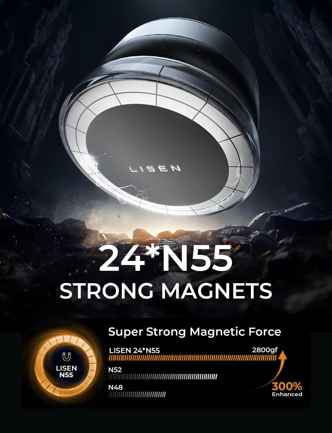 [3RD Upgrade Suction] LISEN is a pioneer in electric suction mount technology. Our 2025 version brings an epic upgrade, eliminating outdated adhesive and manual methods for an effortless, high-tech experience. Vacuum suction cup has 70% more suction power, making it the first motorized phone holder on the market!