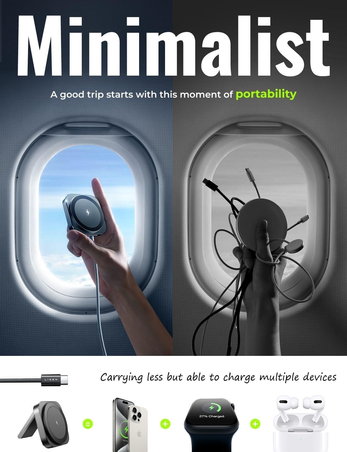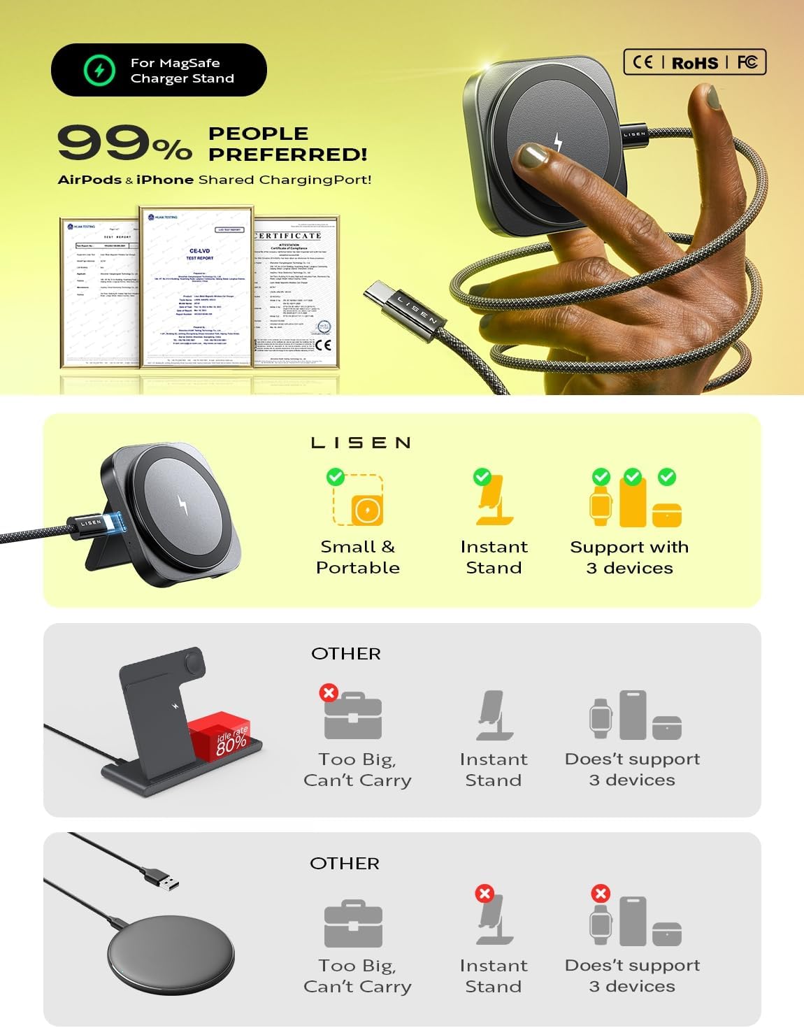 0.3″ Ultra Slim 2-in-1 Upgrade 3 Devices for Apple Magsafe charger Stand. – Introducing LISEN Minimalist Magic for Mag safe charger, the game-changing upgrade from cumbersome 3 in 1 charging station apple. This incredible upgrade is not just more convenient — it’s a whole new level of ease slim. Imagine a slim design that’s 100% more convenient than traditional 3-in-1 chargers. After all 90% of the time, you only need to recharge for two Apple devices at the same time!