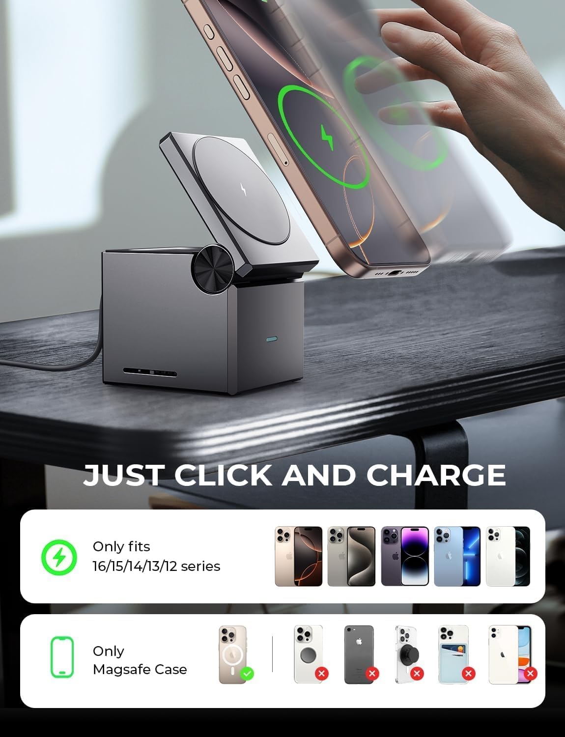 Effortless Charging Experience: Say goodbye to tangled cables and hello to seamless charging with this Qi2 MagSafe-compatible charger. Its strong magnetic connection ensures easy alignment and fast charging for your iPhone, Apple Watch, and AirPods
