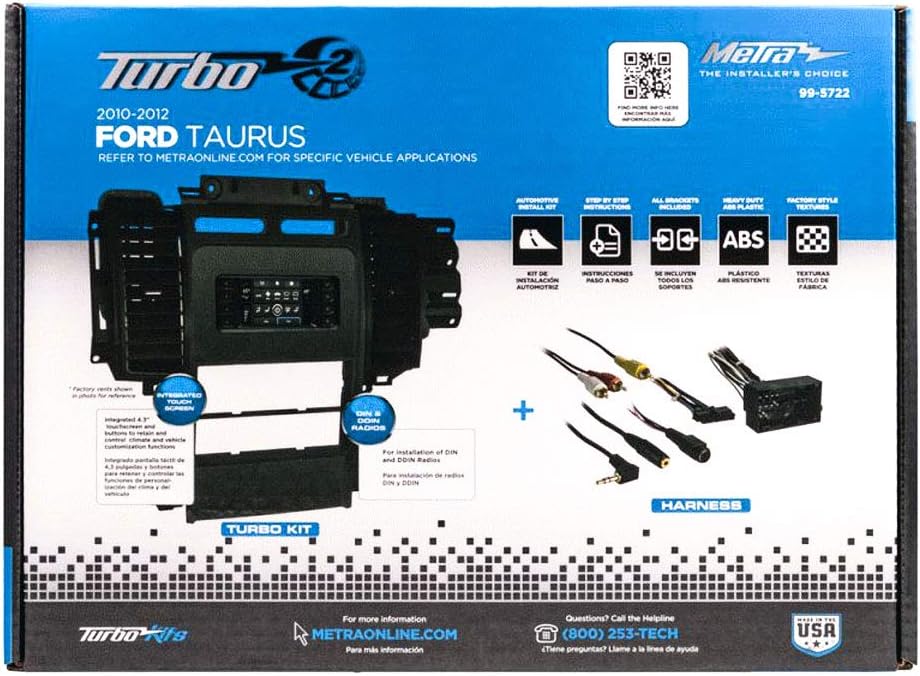 Single or Double DIN Radio Install Dash Kit for select 2010 to 2012 Ford Taurus vehicles allows you to install a double DIN aftermarket radio or a single DIN aftermarket radio into your vehicles dash opening and retains your steering wheel audio controls, sync, RAP, and aux jack. Includes storage pocket for mounting under single DIN radio, touchscreen display panel and wiring harness. Designed and manufactured with precision tolerances for a gapless fit between the dash and the kit.
