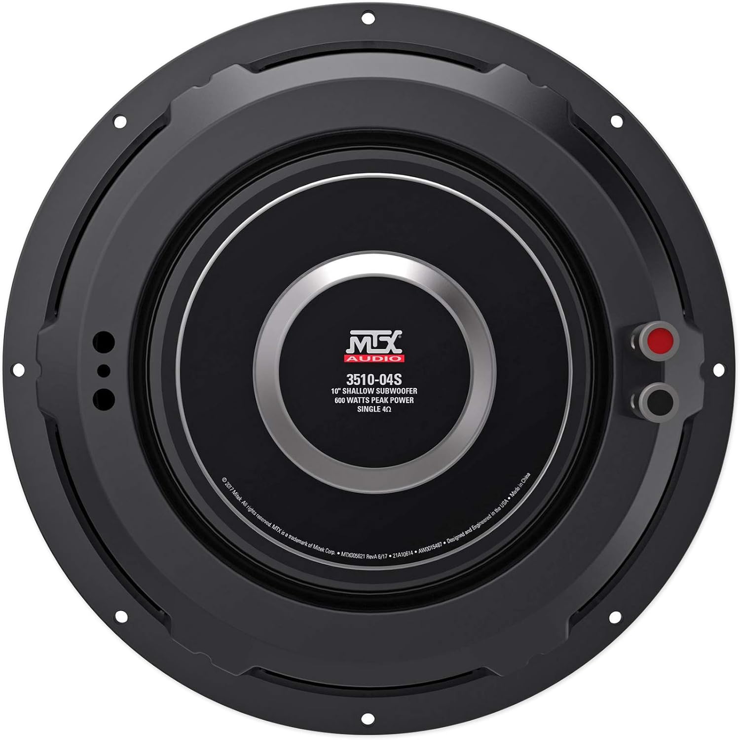 MTX 3510-04S 10″ 300-Watt RMS 4Ω Shallow Car Audio Subwoofer The 35 Series shallow subwoofers utilize technologies found in other MTX subwoofers to deliver exceptional bass in a variety of applications. Its shallow mount design make it perfect for tight spaces where you still need bass. The 3510-04S is a 10″ single voice coil, 4Ω, 300-watt shallow mount Car Audio Subwoofer designed to deliver outstanding SPL and sound quality in an affordable combination of state-of-the-art MTX technologies. The MTX Inverted Apex Surround This subwoofer features a new Inverted Apex surround that increases surface area allowing for more air movement and higher SPL, and a progressive suspension that lowers distortion resulting in improved Low profile sound quality. This subwoofer also incorporates Spider Plateau Venting which is a mechanical cooling process that targets cool air at the voice coil effectively managing the temperature for long term performance. 35 Series subwoofers are ideal for improving the sound in any vehicle. Their low profile does not require a large enclosure so they are perfect for most vehicles. SPECIFICATIONS: Recommended Amp Power (RMS): 150 – 300 Frequency Response: 28Hz – 130Hz Impedance: 4Ω Sensitivity: 83.7db (1W/1m) Voice Coil: 2″ (5.08 cm) Magnet Weight: 44 oz Mounting Depth: 3.375″ (8.57cm) Cut Out Diameter: 9.125″ (23.18cm) Volume Displacement (cu in): 24.55 cu in Sealed Enclosure Net Volume: .7 cu ft