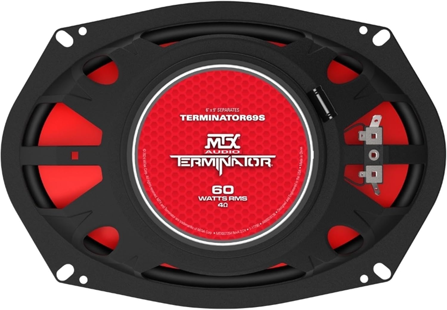 Perfect Factory Upgrade Designed with a shallow 2.75-inch mounting depth, the TERMINATOR69S fits seamlessly into most vehicle doors, making installation a breeze. Its 4Ω impedance ensures compatibility with both factory and aftermarket systems, so you can upgrade your sound without worrying about complex wiring or modifications. The TERMINATOR69S features a dedicated 1-inch silk dome tweeter, delivering crisp, detailed highs while the polypropylene woofer produces deep, punchy bass. With the tweeter separated from the woofer, these component speakers create a more accurate soundstage for a balanced, immersive listening experience. Aggressive Style With a bold red woofer cone and a sleek, removable grille, the TERMINATOR69S doesn’t just sound great—it looks great, too. The included trim ring conceals mounting screws for a clean, professional finish that complements any interior. Terminating Bad Sound Blown factory speakers? Weak, muddy audio? The TERMINATOR69S is here to put an end to all of that. Engineered for superior sound quality at an unbeatable price, these component speakers deliver crisp highs, deep lows, and a balanced midrange that brings your music to life—no matter what you listen to. Features 6 x 9-inch 4Ω 2-Way Component Speaker Pair 60-Watt RMS / 120-Watt Peak Power Polypropylene Woofer 1-inch Silk Dome Tweeter Shallow 2.75-inch Mounting Depth Durable Steel Basket Spider Plateau Venting Removable Grille for Custom Look SPECIFICATIONS Impedance: 4Ω RMS Power (Watts): 60 Sensitivity: 90.0dB (2.83V/1m) Frequency Response: 49Hz – 20kHz Cone Material: Polypropylene Grille Included: Yes Crossover: N/A Mounting Depth: 2.75″ (70mm) Dimensions Long Side Length: 9 1⁄4″ (234.87mm) Short Side Width: 6 1⁄32″ (162.66mm) Long Side Mounting Length: 8 15⁄32″ (214.94mm) Short Side Mounting Width: 5 5⁄16″ (142