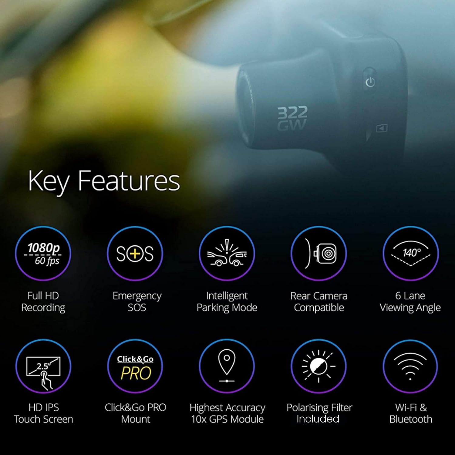 FULL HD RECORDING & 6-LANE WIDE VIEWS: The 322GW Dashcam records in 1080p/30fps and 720p/60fps with 140-degree angle, capturing details of the road ahead