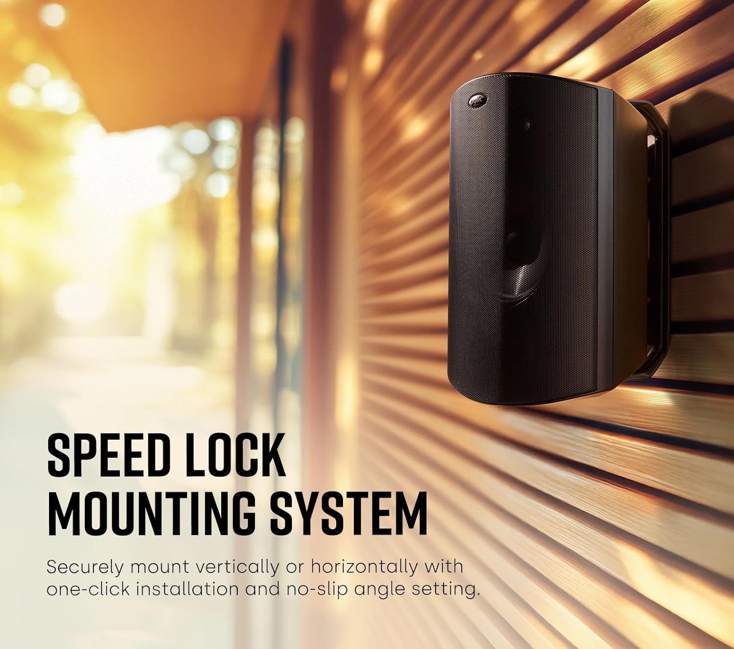 EASY INSTALLATION – One-click speed-lock mounting bracket for wall mount speakers offers anti-slip, one-handed installation; mount these outdoor speakers wired vertically or horizontally to deliver optimal sound in different setups