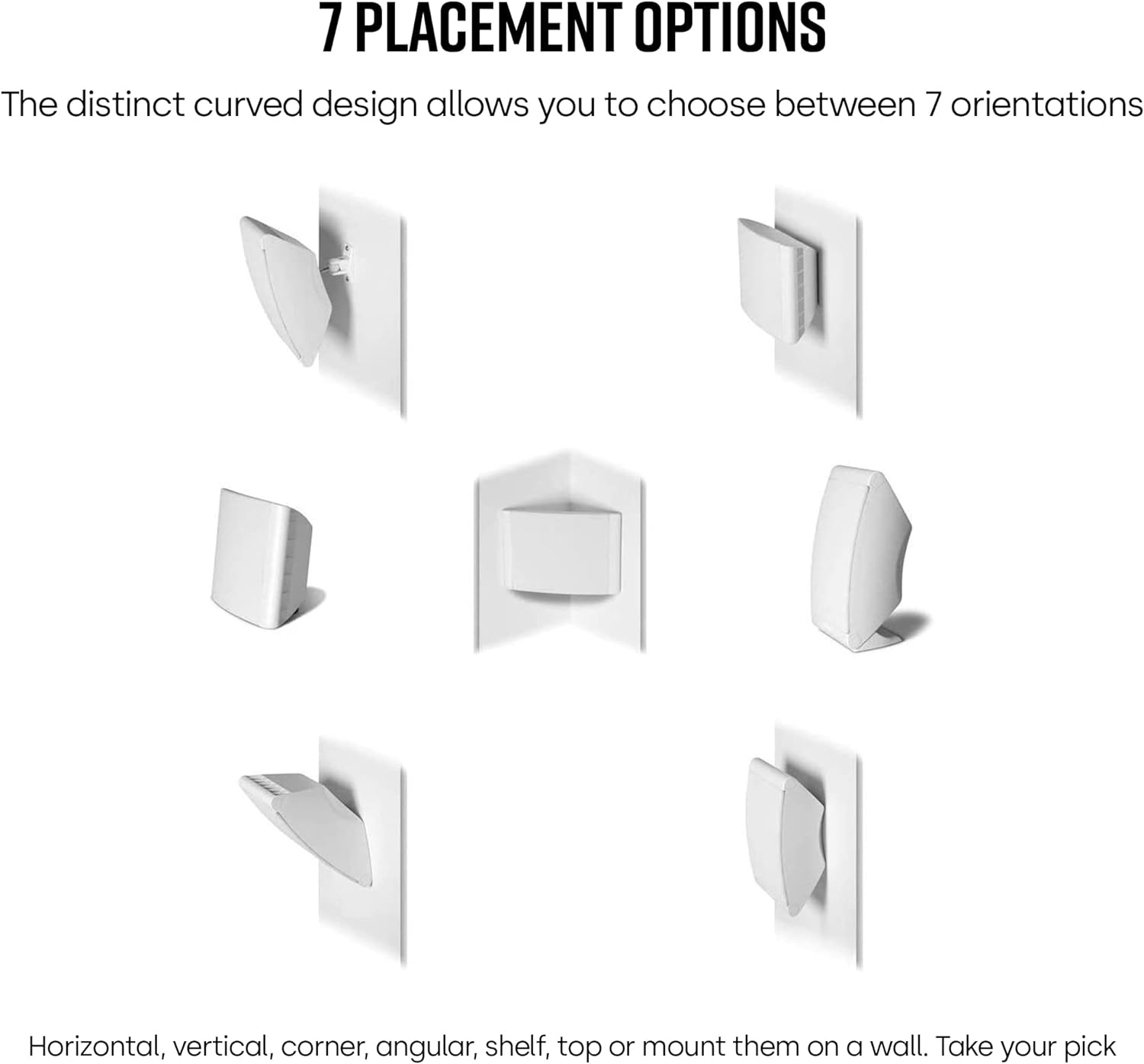 7 UNIQUE PLACEMENT OPTIONS – The DISTINCT CURVED DESIGN allows you to choose between 7 orientations for these wall mounted speakers – horizontal, vertical, corner, angular, shelf, top, or mount them on a wall. Take your pick