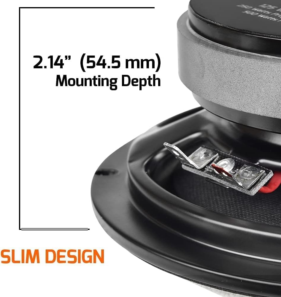 SOLID & COMPACT STRUCTURE: These PRV 6.5 speakers feature a precision-machined aluminum bullet phase plug that acts as a radiator to cool the voice coil and ensure even sound dispersion. Enjoy loud, clear vocals with just 2.14″ of mounting depth – no compromise on quality or performance.