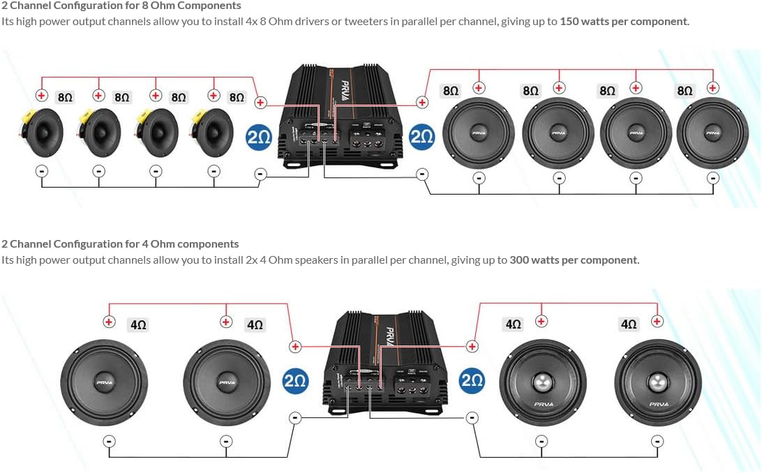 2 Channel car audio amplifier gives you the benefit of wiring multiple speakers and dividing the power per channel. Its 2 Ohm channels allow you to install 8x 8 Ohm drivers or tweeters, 4 per channel in parallel