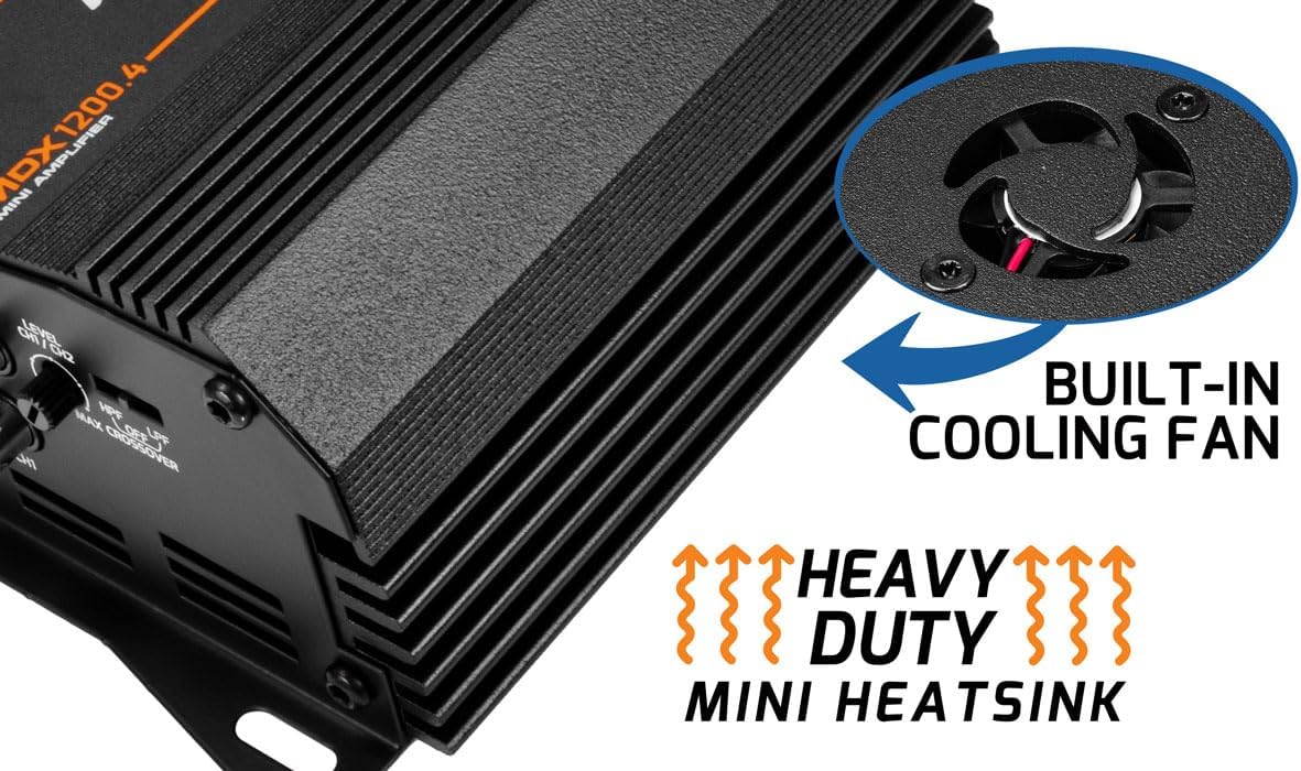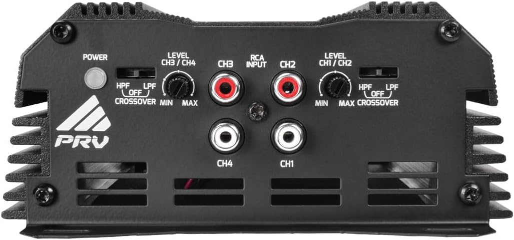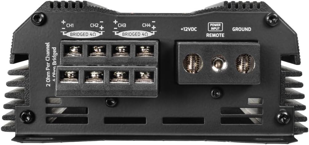 PRV Audio MDX1200.4 2 Ohm Mini 4 Channel Car Audio Amplifier 4 x 300 Watts RMS at 2 Ohm – 1200 Watt 12 Volts Bridgeable Amp for Powersports, Motorcycles, ATV, for High Power Stereo Speaker Systems || 4 x 300 watts at 2 Ohm TRUE RMS certified at full range output Digital Class D Brazilian Technology, gives you the benefit of wiring multiple speakers and dividing the power per channel || 4 Channel car audio amplifier stable at 2 Ohm gives you the benefit of wiring multiple speakers and dividing the power per channel. || 2 Channel Bridged – Double the power output to your speakers by bridging two channels. 2x 600 Watts RMS at a minimum impedance of 4 Ohms per bridged channel || A small footprint mini heavy duty heatsink make this micro amplifier easy to install anywhere in vehicles, motorcycles, 4-wheelers: Overall 6.75″ Width by 5.90″ Length and only 2.60″ Height. || The MDX Series mini amplifier is ideal for motorsport applications such as custom motorcycles, ATVs and Slingshots!