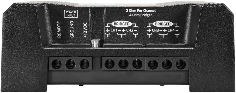 Impedance 2 Ohm Rated Power at 14.0 V at 2 Ohm 4x 100 Watts RMS Rated Power at 14.0 V at 4 Ohm 4x 70 Watts RMS Channels 4 Channel Average Efficiency 80% Operating Voltage 9 to 15 Volts Musical Current Draw 45 A Minimal Power Wire Input (OFC) 8 Gauge wires Built-in Crossover Fixed HPF & LPF at 90 Hz Minimal Speaker Wire Output 14 Gauge Frequency Response(-3dB) 20 – 25,000 Hz Signal to Noise >90 dB Signal Input 2 Pair RCA Protection System High Temperature / Short circuit on Output Heat Sink Type Heavy Duty Cast Aluminum Dimensions ( WxDxH ) 4.00″ x 5.40″ x 2.00″