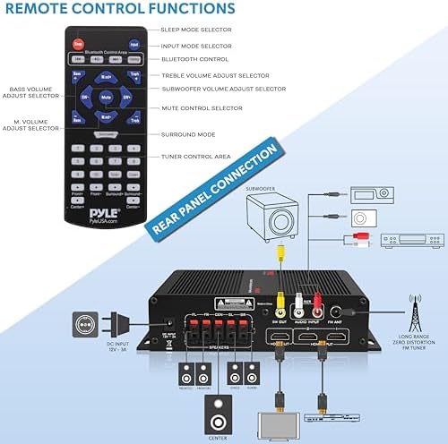 Compact 5-Ch. Bluetooth Amplifier Compact 5-Channel Bluetooth Amplifier, Hi-Fi Amp Receiver with HDMI, LCD Display, FM Radio Features: 5-Channel Powered Amp Design Lightweight & Compact Size Bluetooth Wireless Music Streaming Receiver Hassle-Free Connection with Automatic Pairing Ability FM Radio with Digital LCD Display Front Panel Button Control Center HDMI Output + (2) HDMI Inputs Aux RCA (L/R) Audio Input Jacks Spring Loaded Speaker Terminal Connectors Full Range Stereo Sound Reproduction RCA Subwoofer Output Includes Remote Control Bluetooth Connectivity: Built-in Wireless Music Streaming Receiver Compatible with All of Your Favorite Bluetooth Devices (iPhone, Androids, Smartphones, iPad, Tablets, etc.) Bluetooth Version: 4.0 Bluetooth Network Name: ‘PyleUSA’ Technical Specs: MAX Power Output: 100 Watt (5 x 20W) HDMI 2160p Support Bluetooth Protocol Support: AVRCP V1.4 Construction Material: Metal, Aluminum Alloy Power: 110/220V (12V Power Adapter) Dimensions: 8.0’’ x 5.8’’ x 2.0’’ The Pyle Compact 5-Channel Bluetooth Amplifier, Hi-Fi Amp Receiver with HDMI, LCD Display, FM Radio – 5-Channel Powered Amp Design – Lightweight & Compact Size – Bluetooth Wireless Music Streaming Receiver – Hassle-Free Connection with Automatic Pairing Ability – FM Radio with Digital LCD Display – Front Panel Button Control Center – HDMI Output + (2) HDMI Inputs – Aux RCA (L/R) Audio Input Jacks – Spring Loaded Speaker Terminal Connectors – Full Range Stereo Sound Reproduction – RCA Subwoofer Output – Includes Remote Control – Bluetooth Connectivity: – Built-in Wireless Music Streaming Receiver – Compatible with All of Your Favorite Bluetooth Devices – (iPhone, Androids, Smartphones, iPad, Tablets, etc.).
