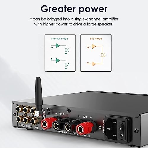 Multiple Input Terminals:Bluetooth amplifier supports RCA, USB, bluetooth 5.0 input.Wireless bluetooth 5.0 reception, better sound quality, and stable signal. Bluetooth amplifier is suitable for smartphones, tablets, and other device connections. A large number of audiophile-grade audio components are used to improve the subjective sense of hearing.