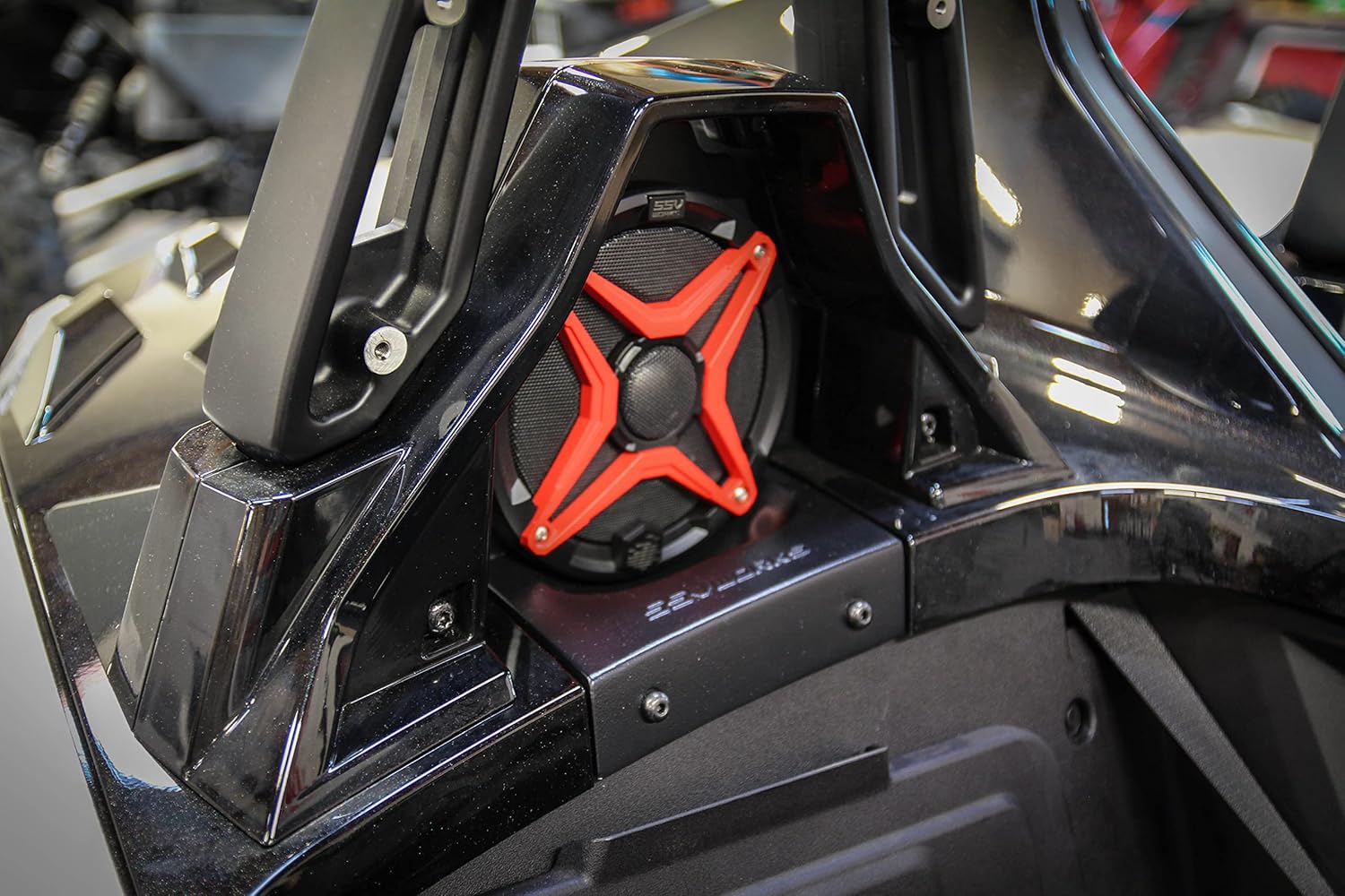 Fitment: SSV Works SS-B65 speaker pods are designed to fit behind the head in the rear deck hump area of the Polaris Slingshot. By removing the factory panels and re-using the factory mounting hardware, the enclosure perfectly and seamlessly.
